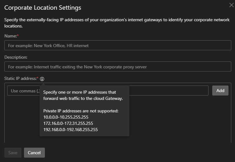 Cloud Gateway 在 Add Corporate Location 時,針對來自於組織特定外部 IP 的流量設定時區